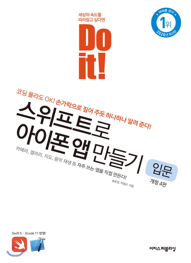 아이폰 분야 1위 도서, 『Do it! 스위프트로 아이폰 앱 만들기 입문』 개정 4판이 출간되었다. 이번 개정에서는 Swift 5, Xcode 11 버전을 반영했다. 이 책은 첫 장부터 Xcode를 설치하고 예제를 통해 앱을 만드는 실습을 시작한다. 초보자도 실습을 잘 따라올 수 있도록 하나하나 알려줘서 코딩 경험이 전무한 사람도 충분히 읽을 수 있다. 예제를 따라 하다가 문법이 궁금해질 즈음 [스위프트 문법] 코너가 나와 보충 설명을 해주니 문법 공부도 함께 해결된다. 어떤 앱이든 한 번은 써야 할 필수 기능 17개를 엄선해 누구나 손쉽게 원하는 아이폰 앱을 만들 수 있도록 구성했다.