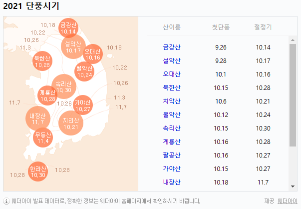 참고로 2021년 단풍시기 정보입니다.