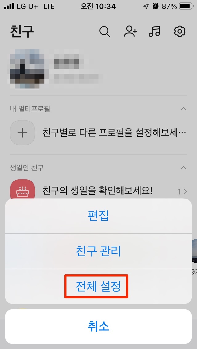 오른쪽 상단의 [설정] 버튼을 클릭한 후 [전체설정] 메뉴를 선택합니다.