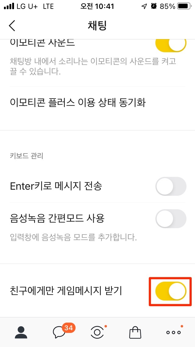[설정 > 채팅] 메뉴로 들어간 후, 맨 아래로 내리면 [친구에게만 게임메시지 받기] 가 있습니다. 이 항목을 켜면 모르는 사람에게는 게임 메시지를 받지 않습니다.
