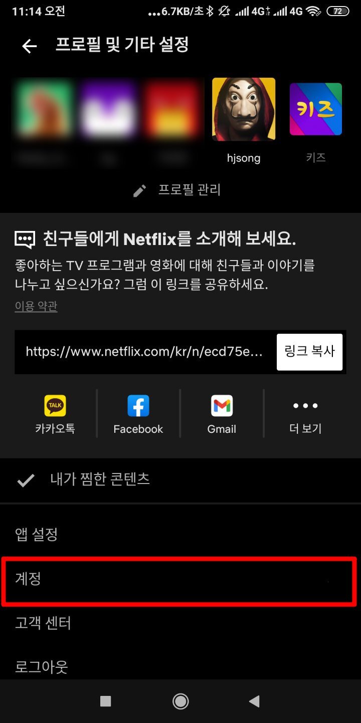 우선 넷플릭스 앱에서 상단 프로필 아이콘을 클릭한 후, [계정]을 클릭합니다.