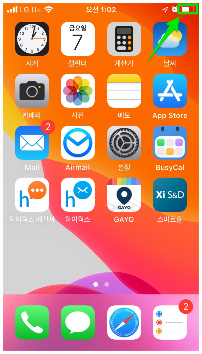 아이폰을 사용하다보면 상단 상태바에 배터리 잔량이 그림으로 보이는 것을 확인할 수 있습니다.