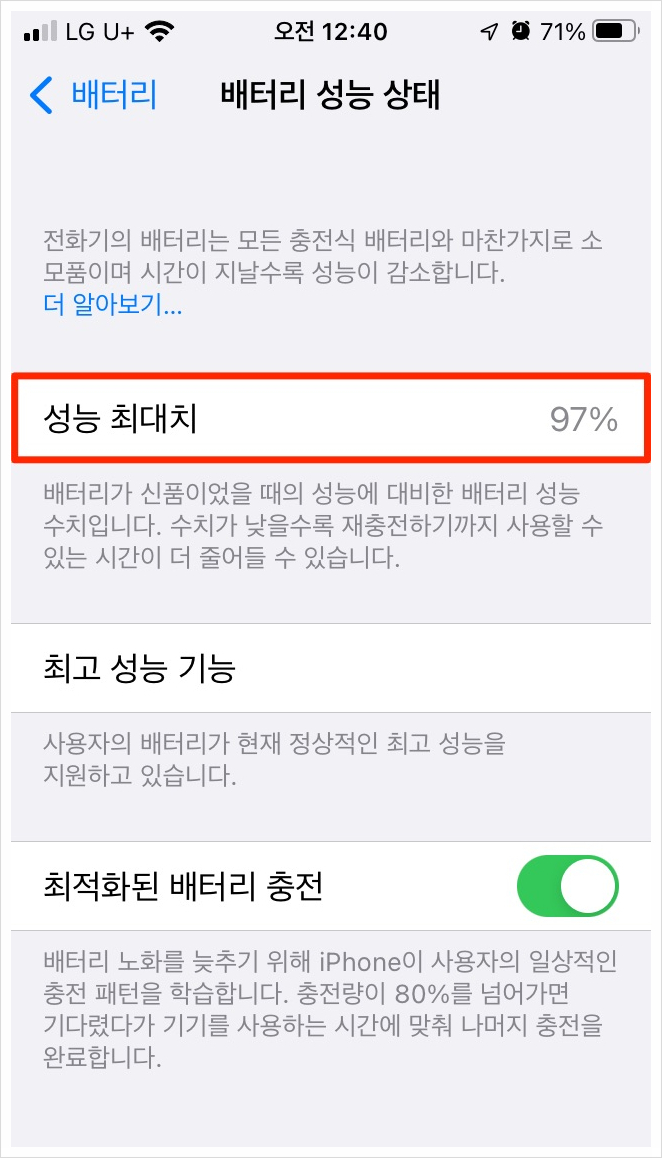 저는 최근 너무 자주 방전되어 배터리를 교체했기 때문에 [성능 최대치]가 97% 입니다.