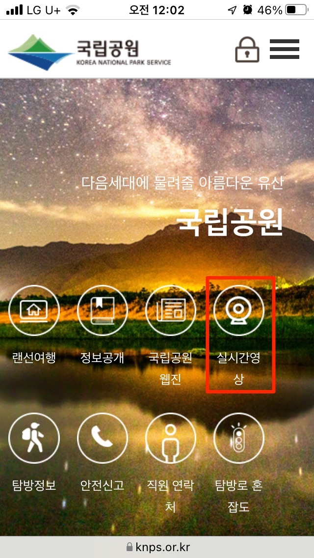 국내의 여러 국립공원의 실시간 영상을 확인할 수 있습니다.
