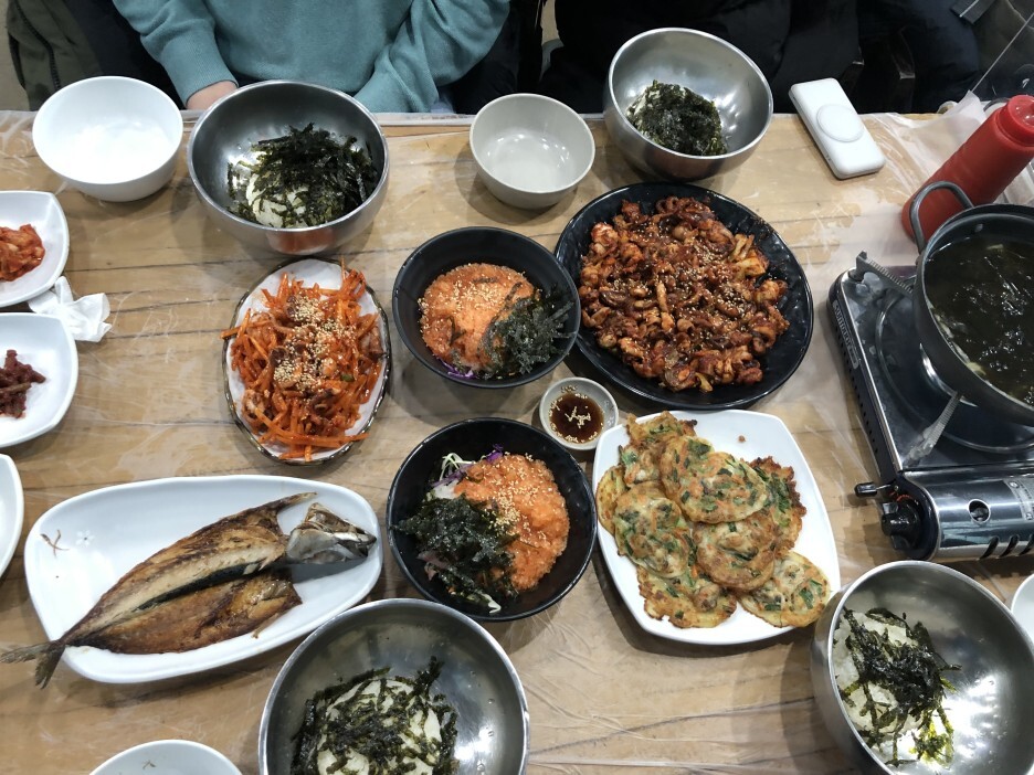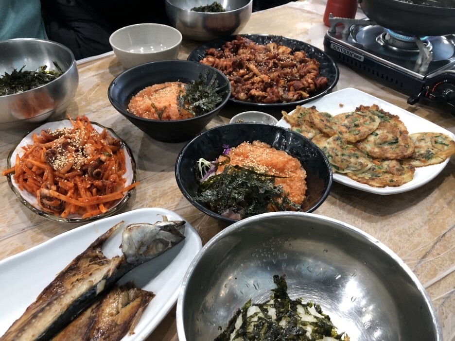 쭈굴볶음과 굴전, 물회, 쭈꾸미무침, 생선구이, 굴미역국, 김가루밥 등이 나옵니다.