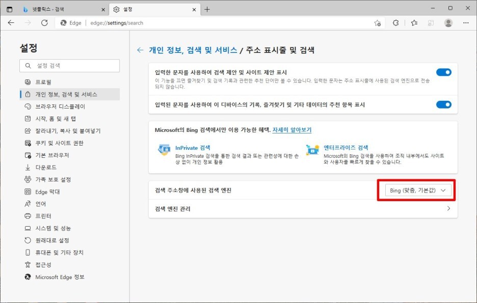 [검색 주소창에 사용된 검색 엔진]이 'Bing'으로 되어있습니다.