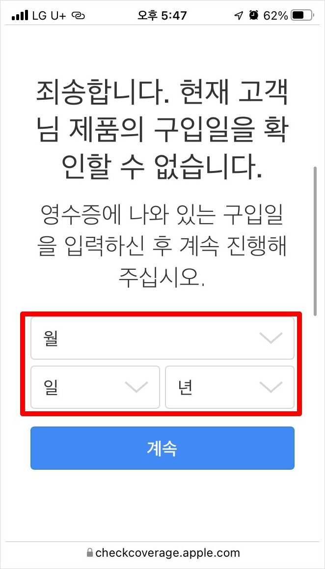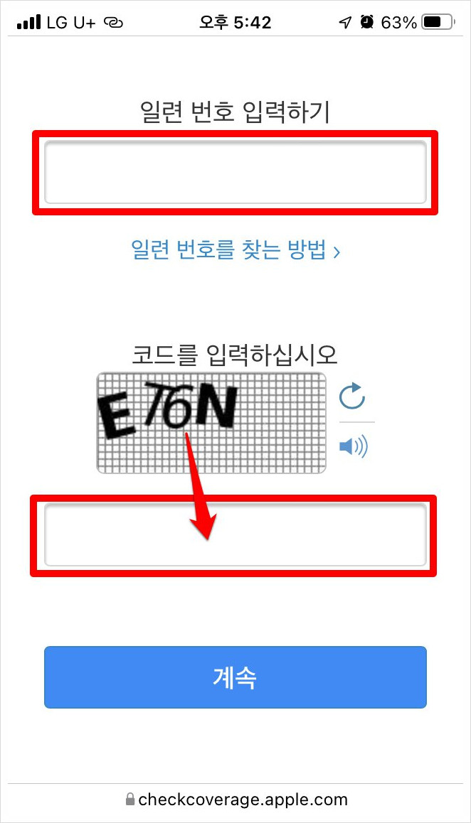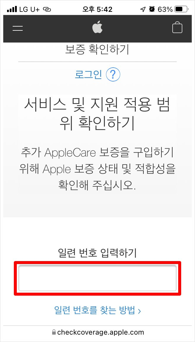 그러면 '보증 확인' 사이트가 나옵니다. 여기서 본인 기기의 일련 번호를 입력합니다.