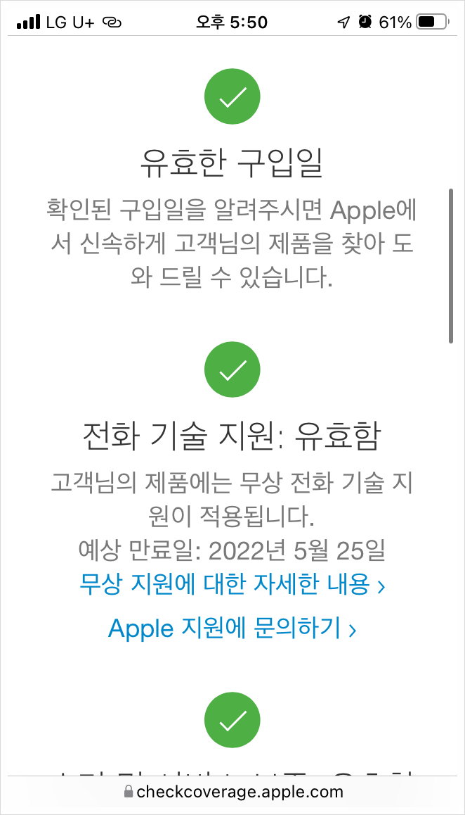 이제 구입일이나 전화기술지원, 수리 및 서비스 보증 모두 유효하다고 나옵니다.
