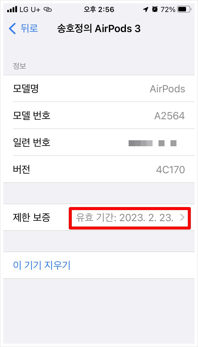 일련 번호는 아이폰>설정>블루투스>에어팟 으로 들어가면 확인할 수 있습니다.
