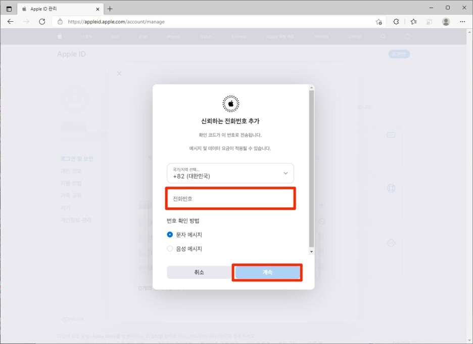 등록하고자 하는 전화번호를 입력하고 '문자 메시지'를 선택한후 [계속] 버튼을 클릭합니다.