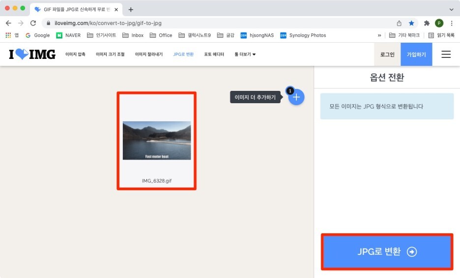 파일이 업로드 되었습니다. 여기서 오른쪽 하단의 [JPG로 변환] 버튼을 클릭합니다.