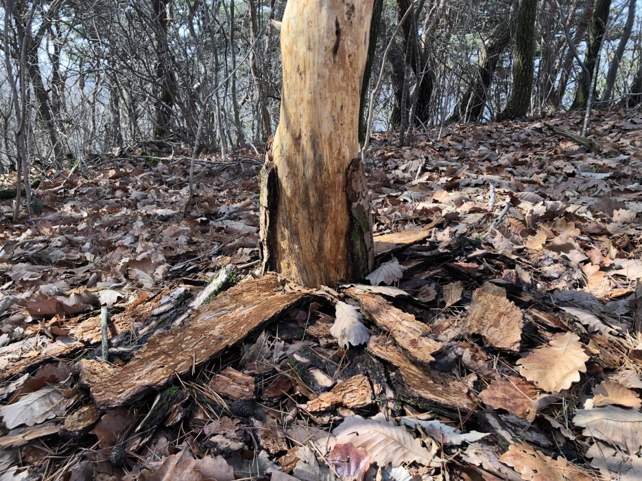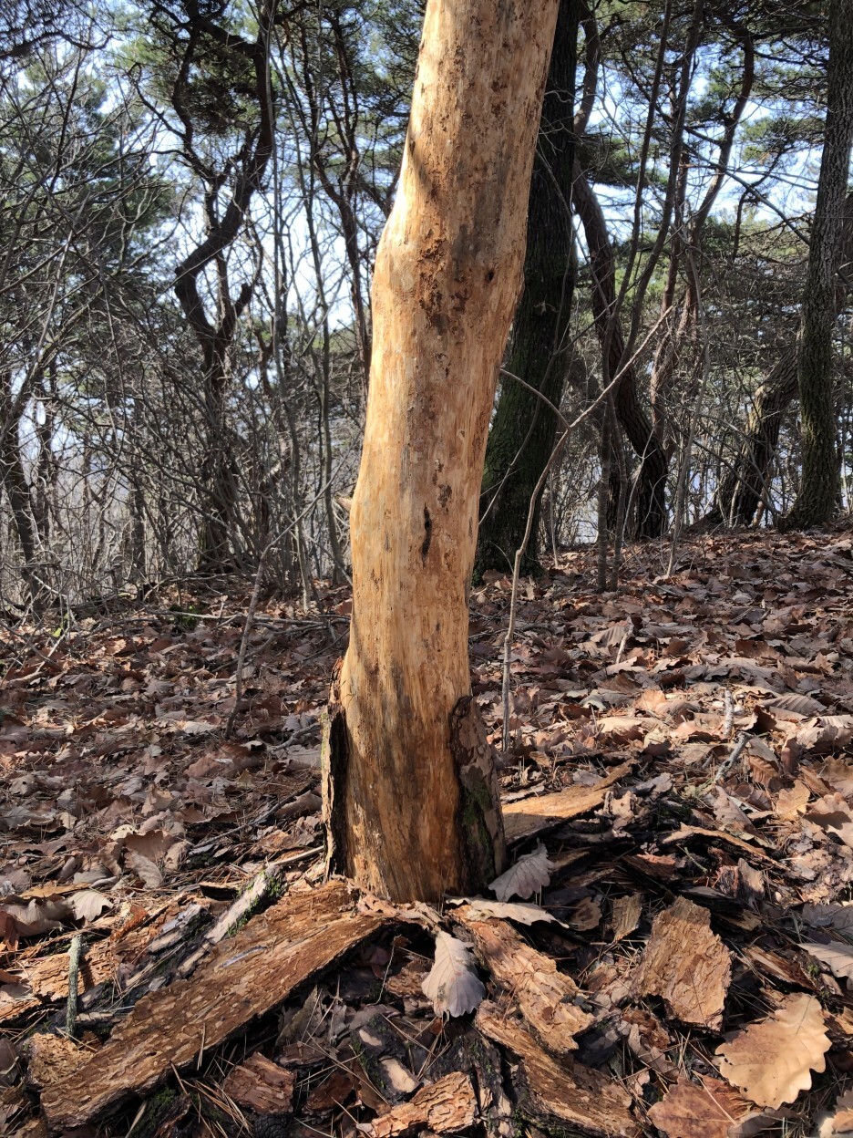 나무 껍질이 다 벗겨진 나무를 발견... 많이 춥겠다... ㅠㅠ