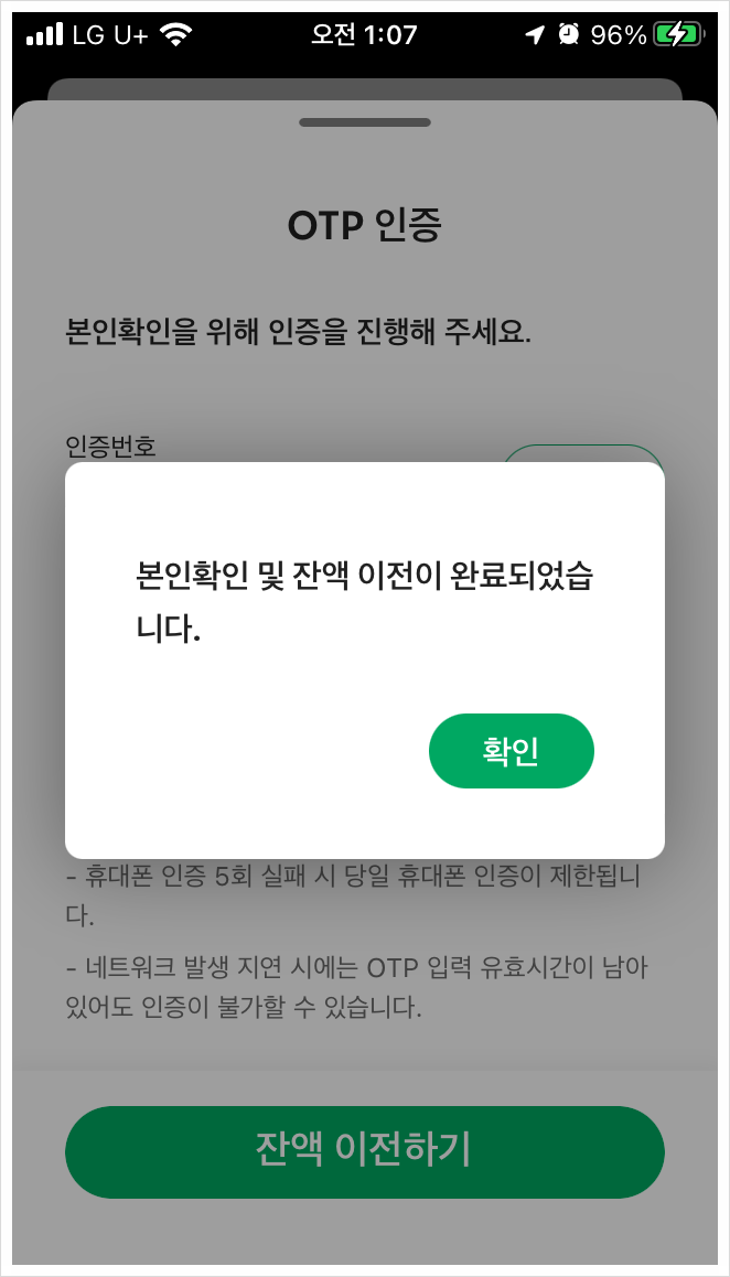 휴대폰으로 전송된 인증번호를 입력한 후 [잔액 이전하기] 버튼을 클릭하면 완료됩니다.