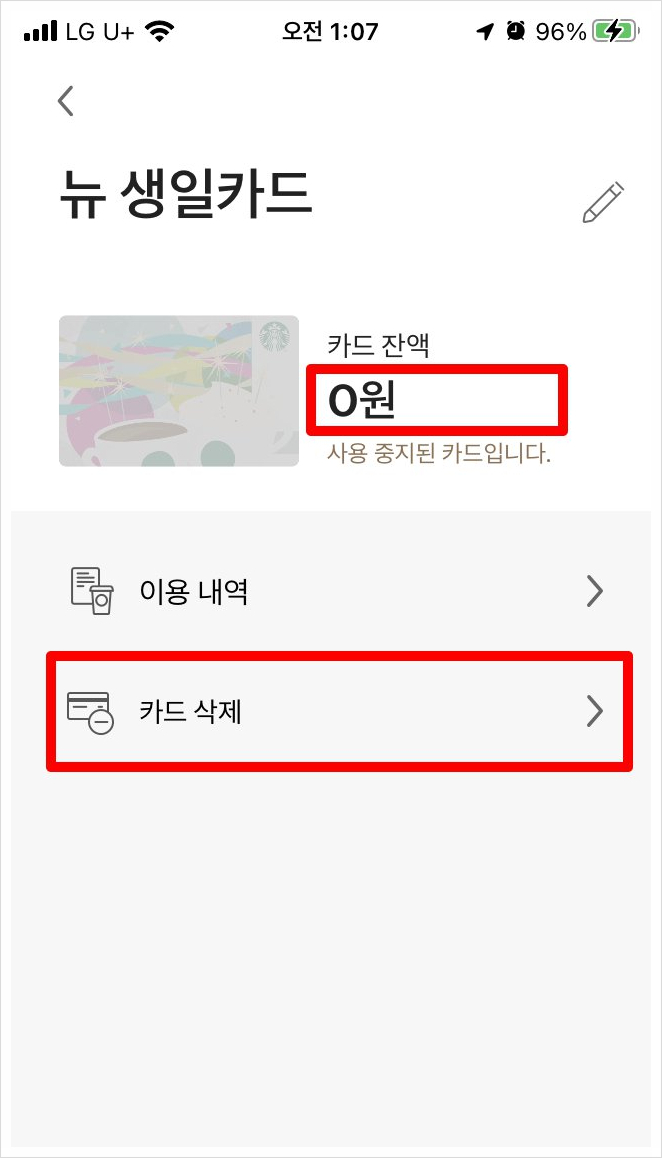 같은 방법으로 [스타벅스 e카드] 잔액을 다른 카드로 이전하고 삭제하였습니다.