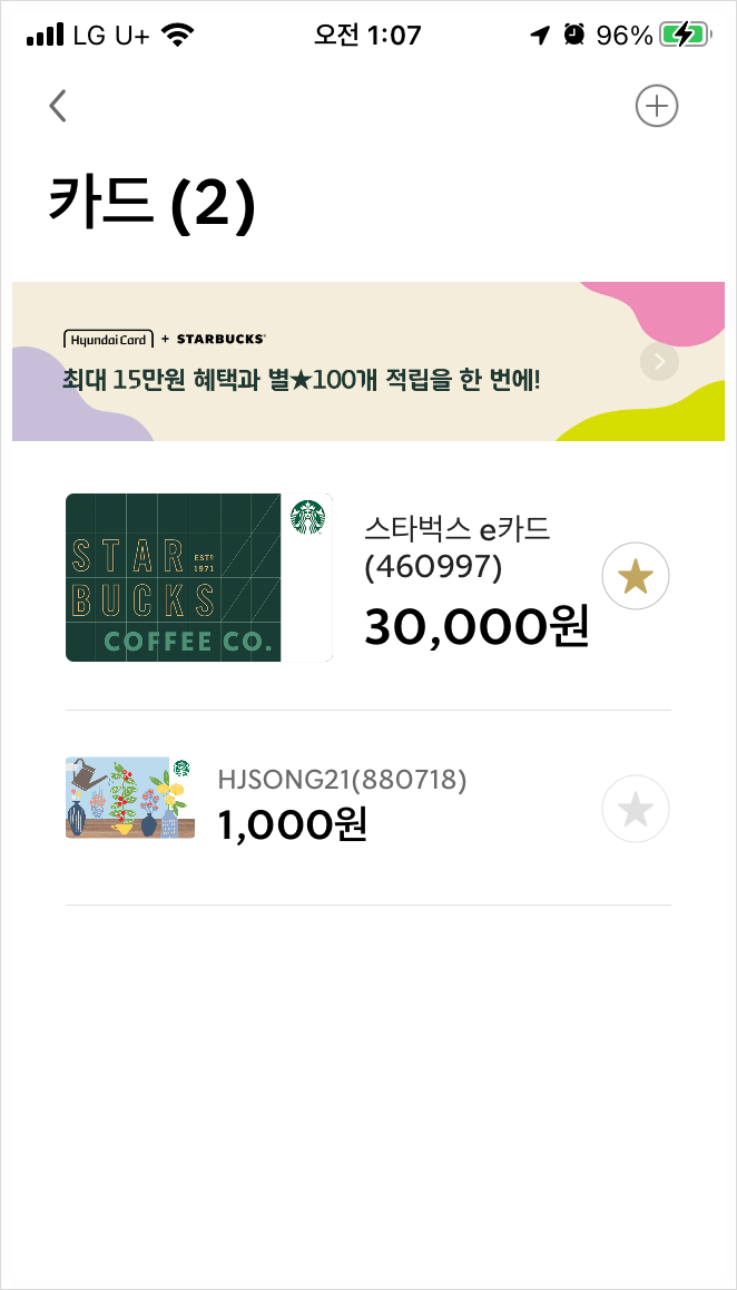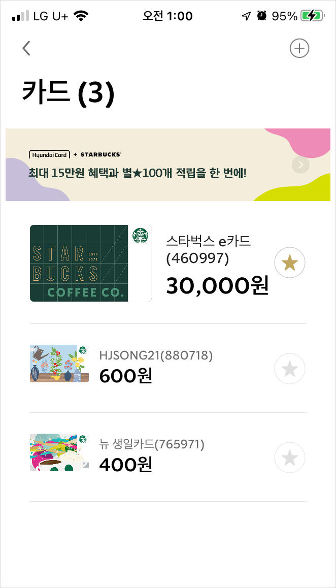 스타벅스 앱에 등록되어 있는 카드가 3개나 됩니다.