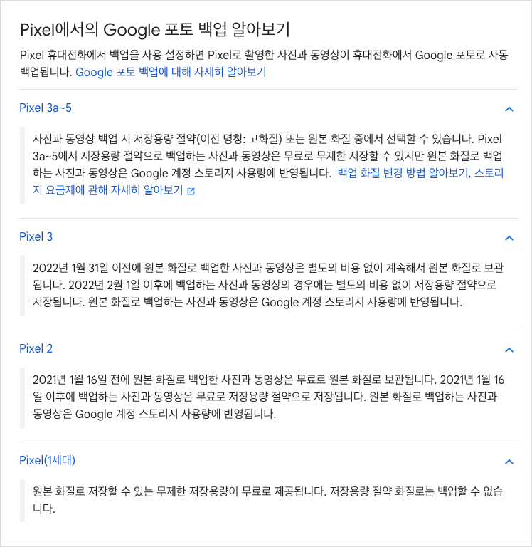 - 픽셀 3a ~ 픽셀 5 : 저장용량 절약화질(고화질) 무제한 저장용량 제공. 원본 화질의 경우 15GB 용량에 포함