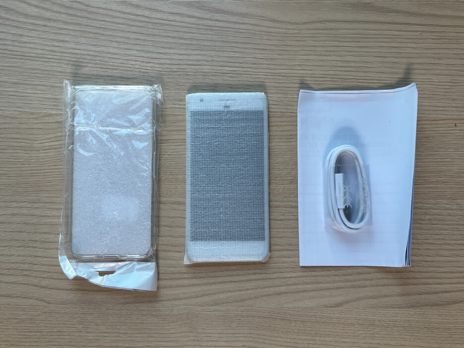 액정보호필름이 부착된 구글픽셀폰, 젤리케이스, USB-C 충전케이블, 출고 검수서.