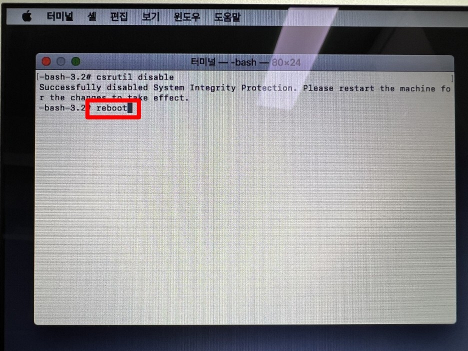5) 터미널에서 reboot을 입력하여 맥북에어를 재부팅 합니다.