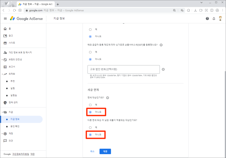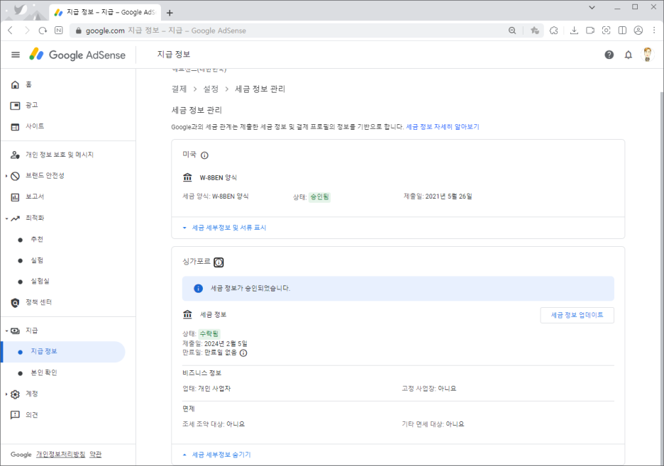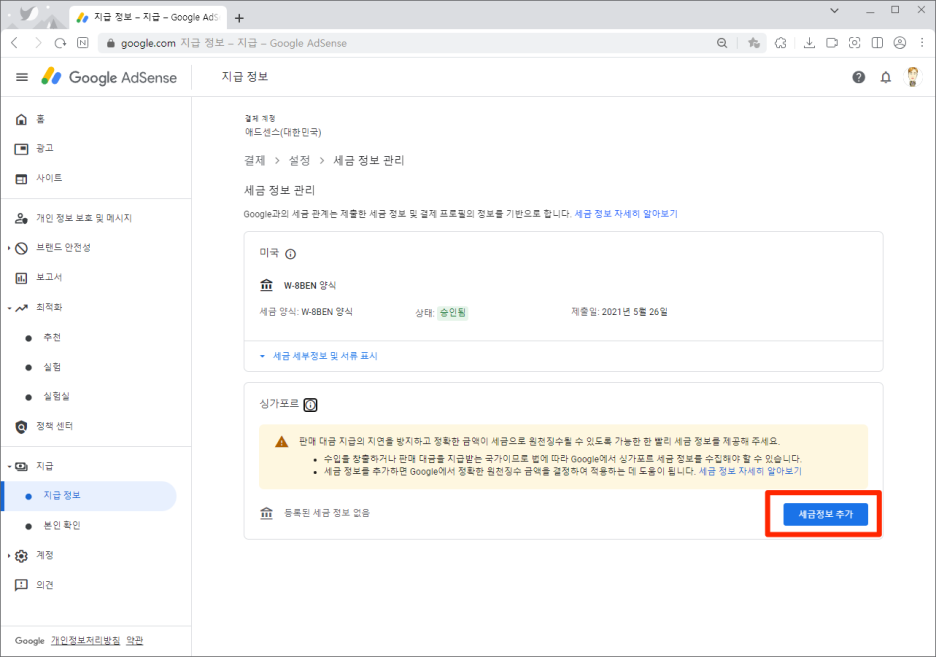 구글 애드센스 싱가포르 세금 정보 추가하기