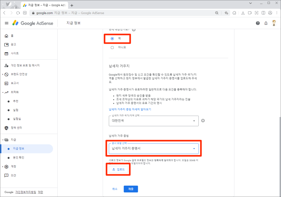 광고 수익이 많으신 분은 두번째를 '예'로 선택하고,