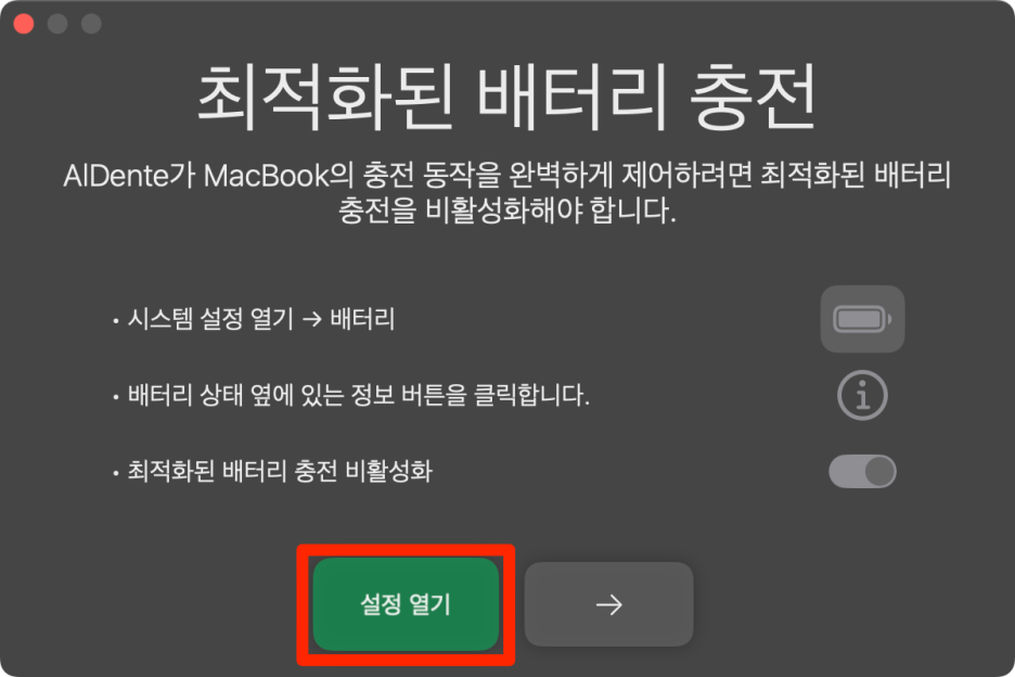 Aldente를 처음 실행하면 다음과 같이 최적화된 배터리 충전을 끄라고 합니다.