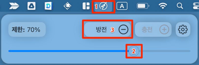 이제 상단의 AlDente 아이콘을 클릭하면 다음과 같이 충전한도 설정창이 나옵니다.