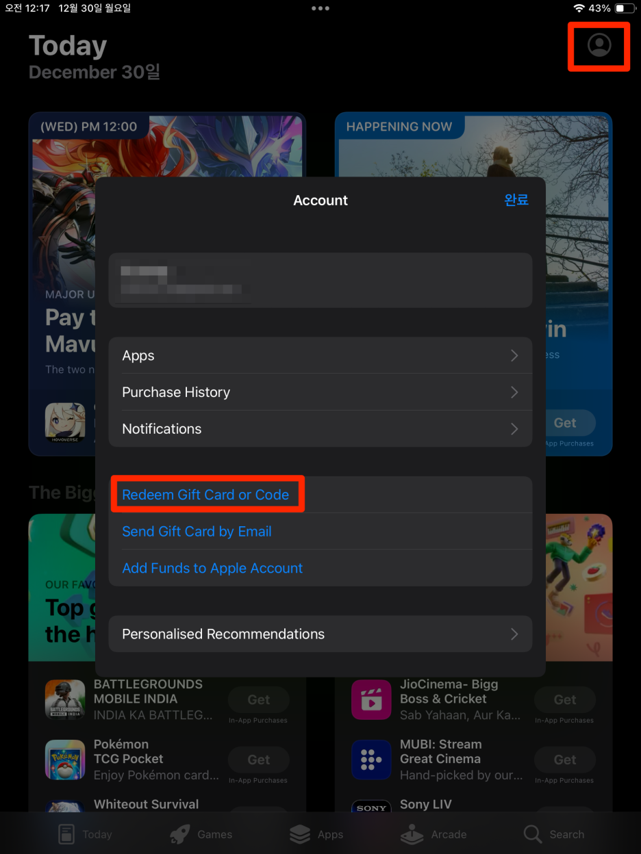 7. 3번에서 구매한 기프트카드로 충전(Redeem Gift Card or Code)