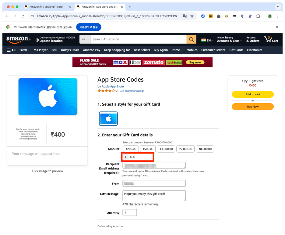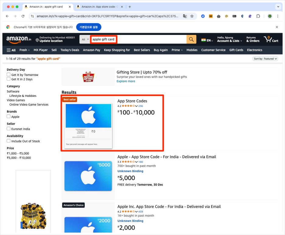 3. 인도 아마존 가입 및 애플 앱스토어 기프트 카드 구매(https://amazon.in/)