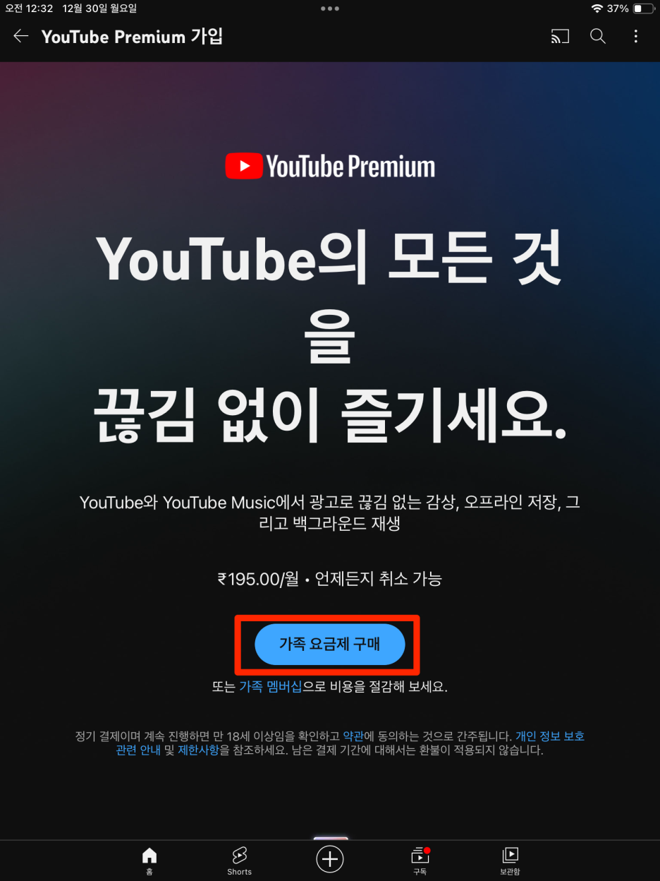- 유튜브 개인 멤버십은 195루피/월, 패밀리 멤버십은 389루피/월(애플에서 구매하는것이 좀 더 비쌈)