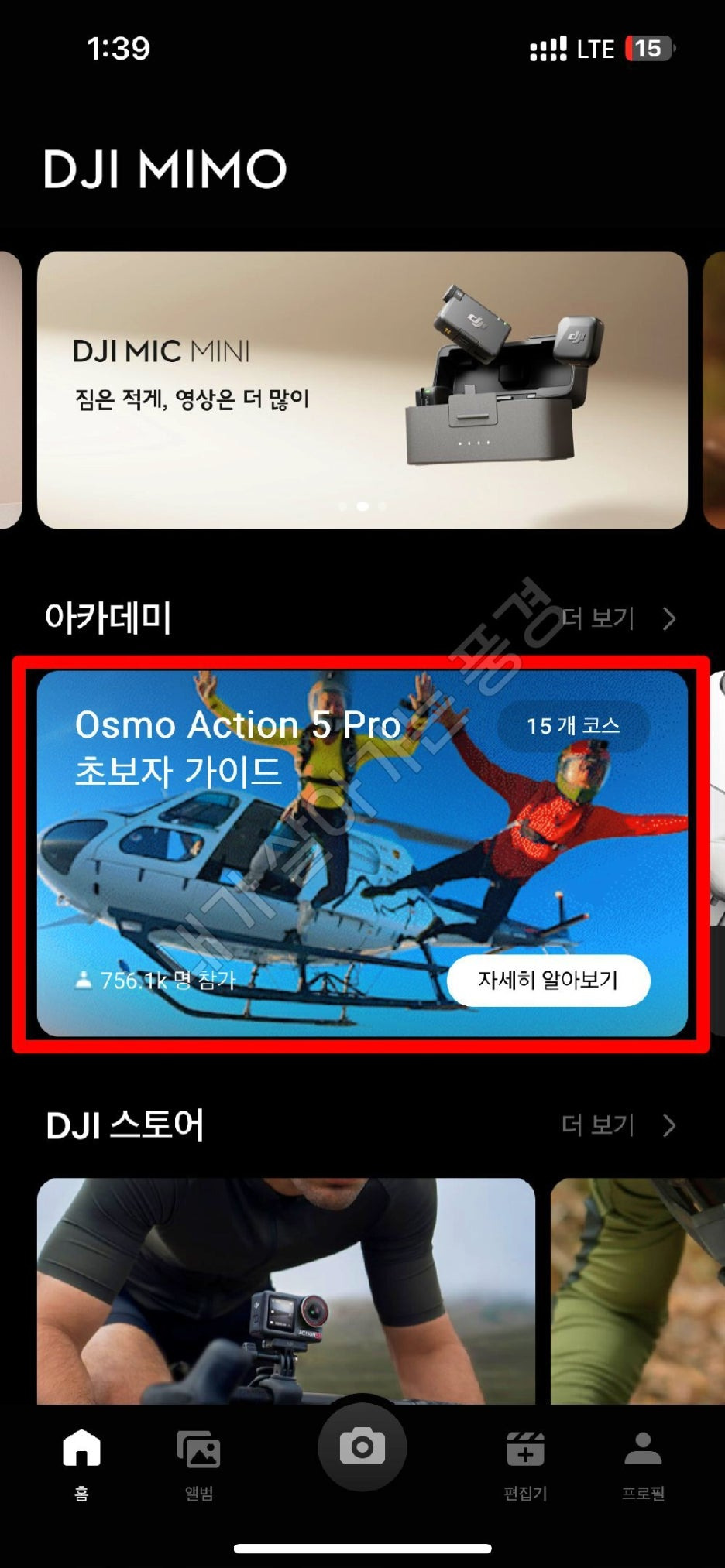 Mimo 앱 메인화면 중간 쯤 [초보자 가이드]가 있습니다. 여기를 클릭하여 동영상을 참고하면 오즈모 액션5 프로의 기본적인 사용법을 배울 수 있습니다.