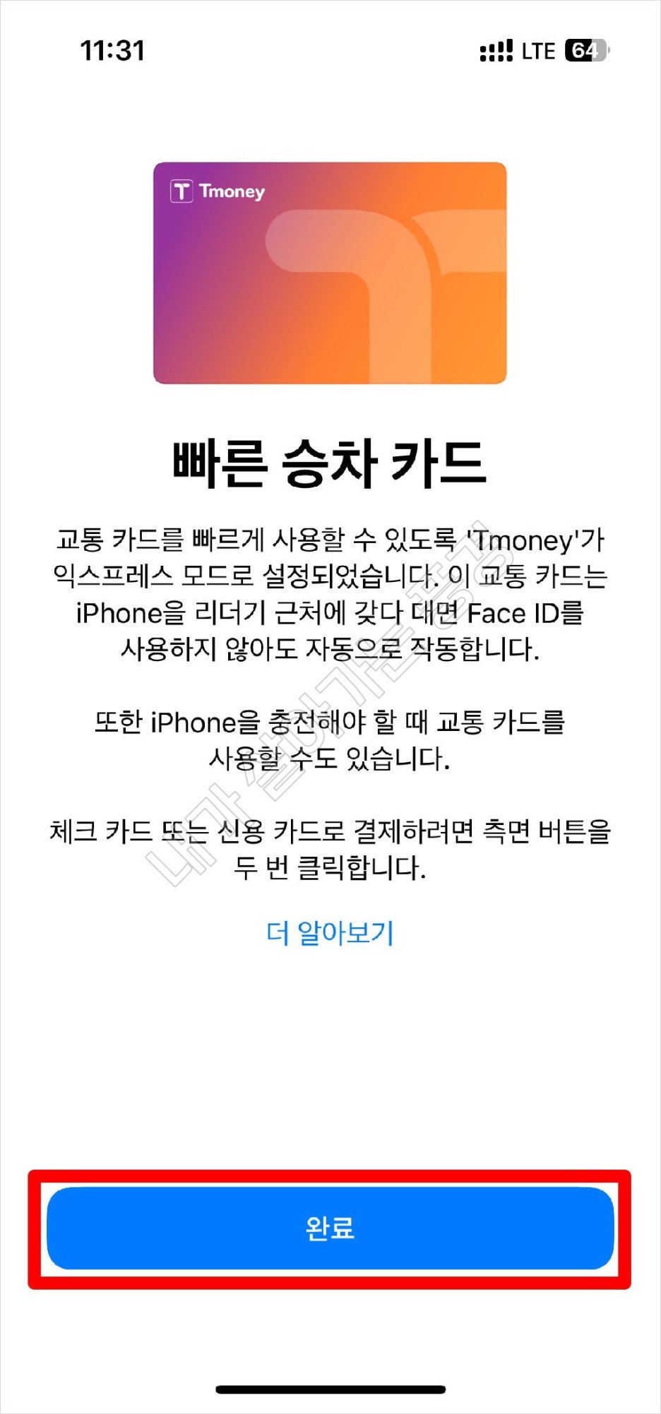 5) Tmoney가 익스프레스 모드로 설정되어 Face ID를 사용하지 않더라고 아이폰을 리더기 근처에 갖다 대면 된다고 합니다. (오~~~~).