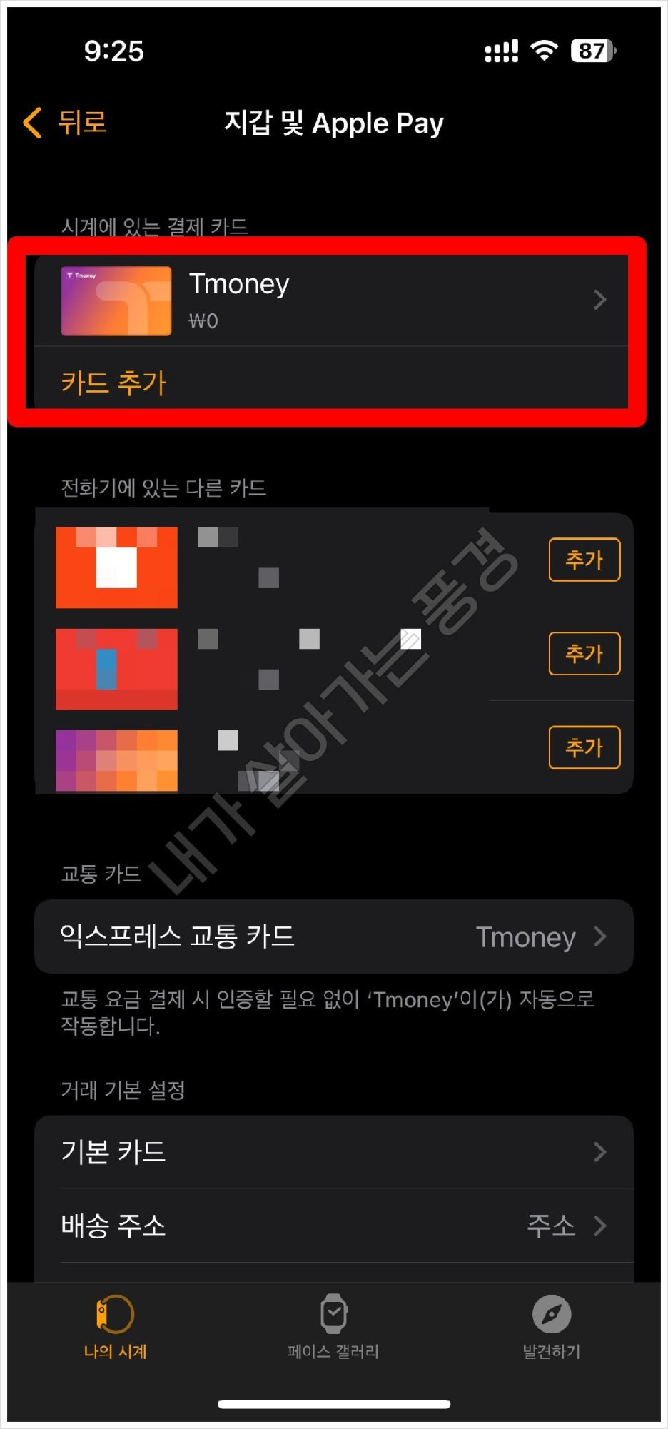 - 애플워치 : 아이폰에서 [Watch]앱을 실행시킨 후 [지갑 및 Apple Pay]로 이동하여 확인.
