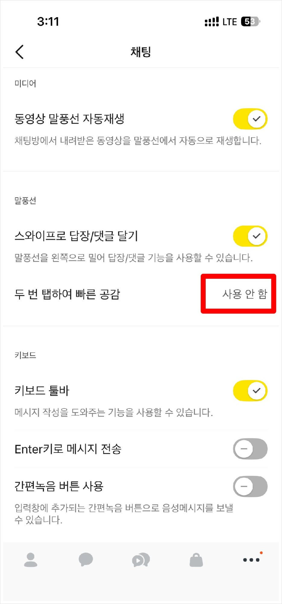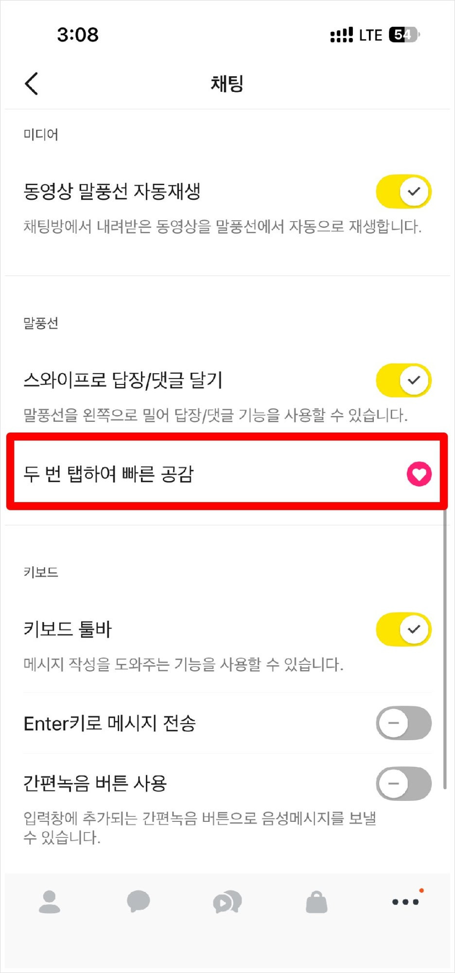 채팅 설정 화면에서 화면을 아래로 내려 "두 번 탭하여 빠른 공감" 항목을 찾아 클릭합니다.