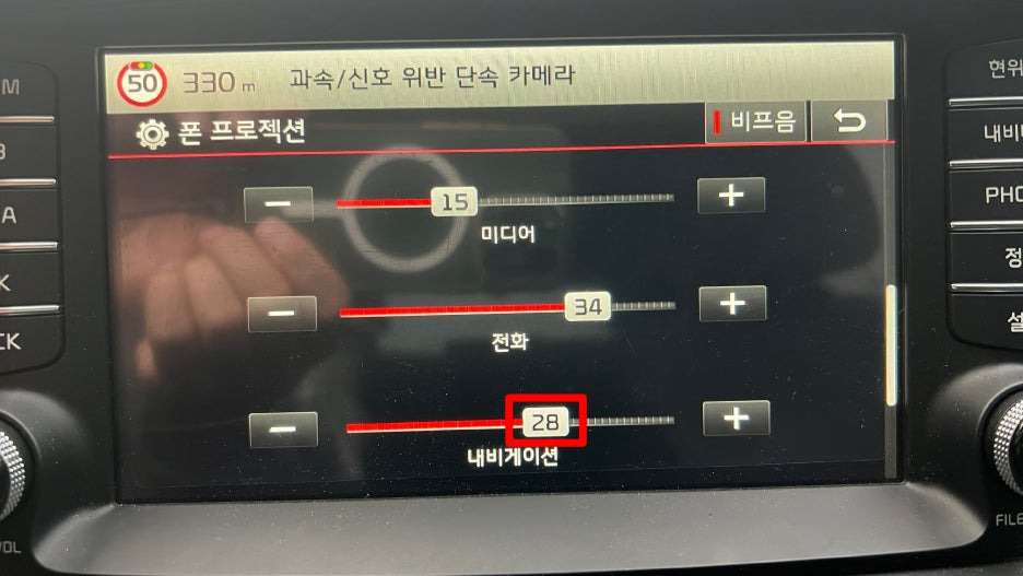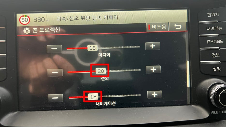 저는 미디어는 15정도, 전화는 20 정도, 내비게이션은 15 정도로 설정해뒀어요.