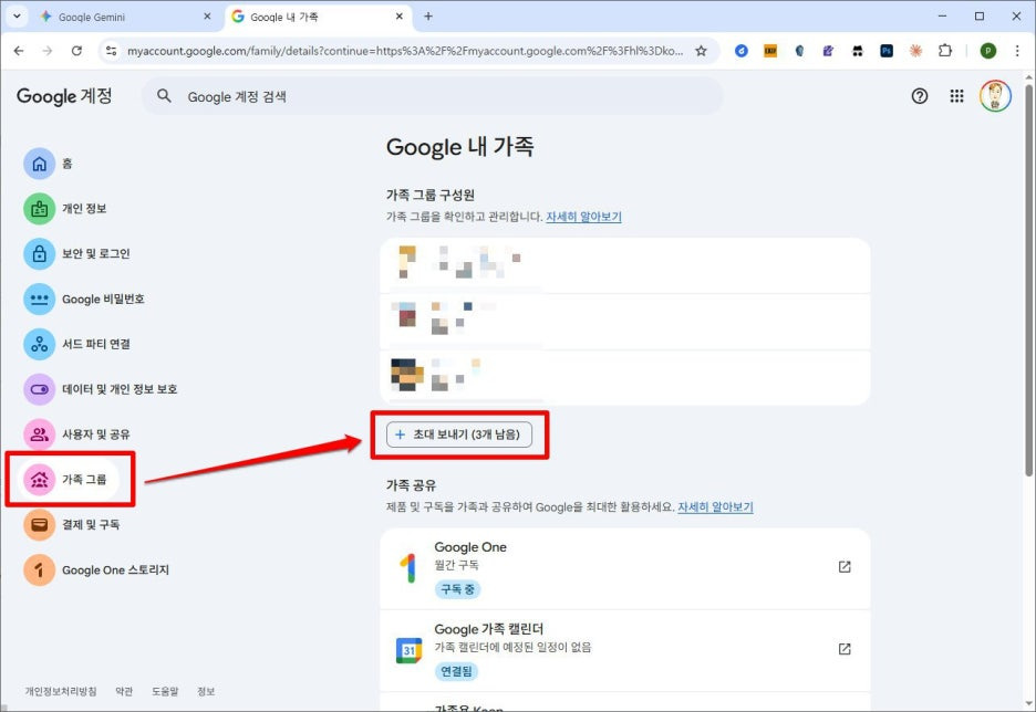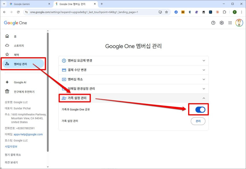 [멤버십 관리]로 들어가서 [가족 설정 관리]에서 "가족과 Google Drive 공유" 스위치를 켜야만 AI Pro 기능을 함께 사용할 수 있습니다.